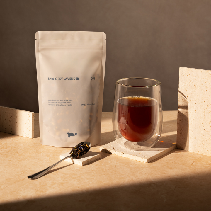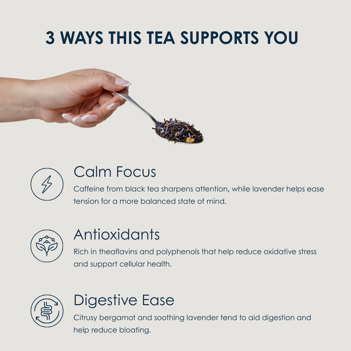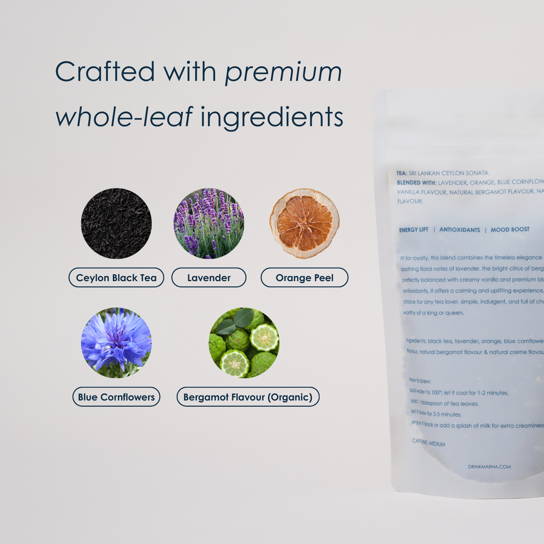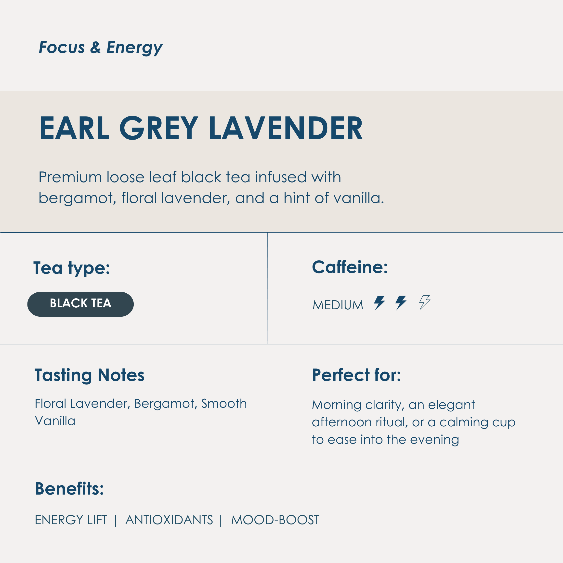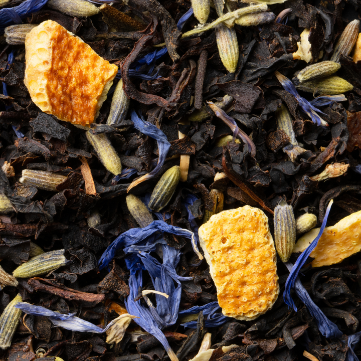 Premium loose leaf Black Tea infused with Bergamot, Floral Lavender, and a hint of Vanilla.
