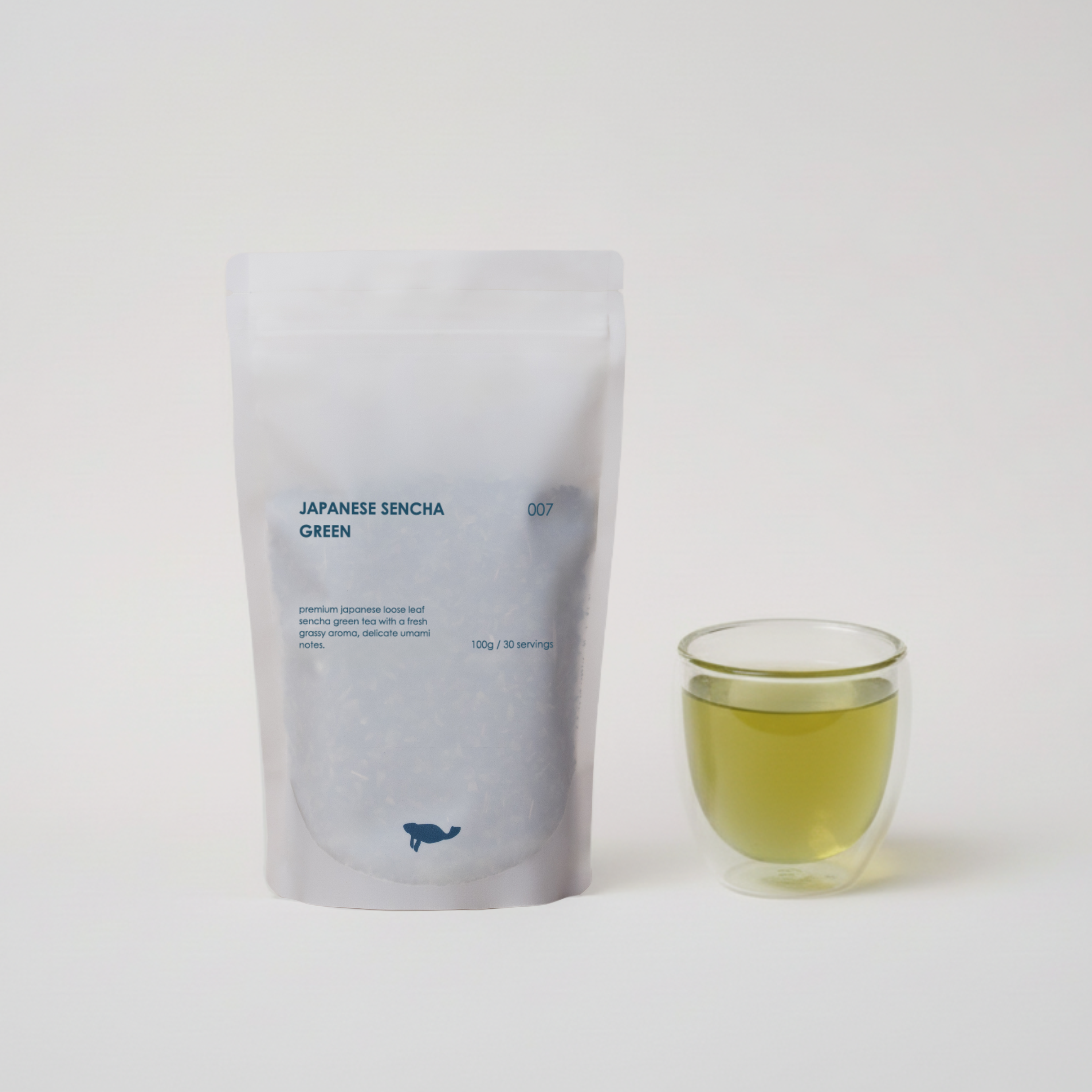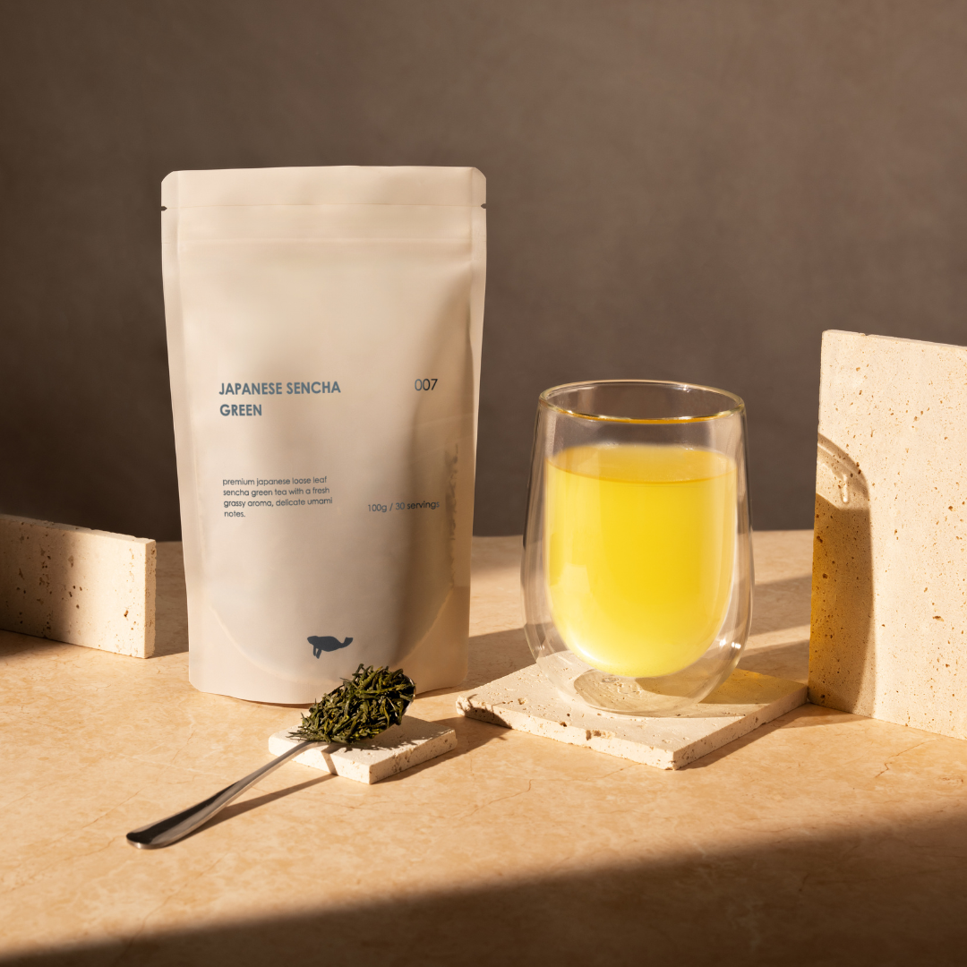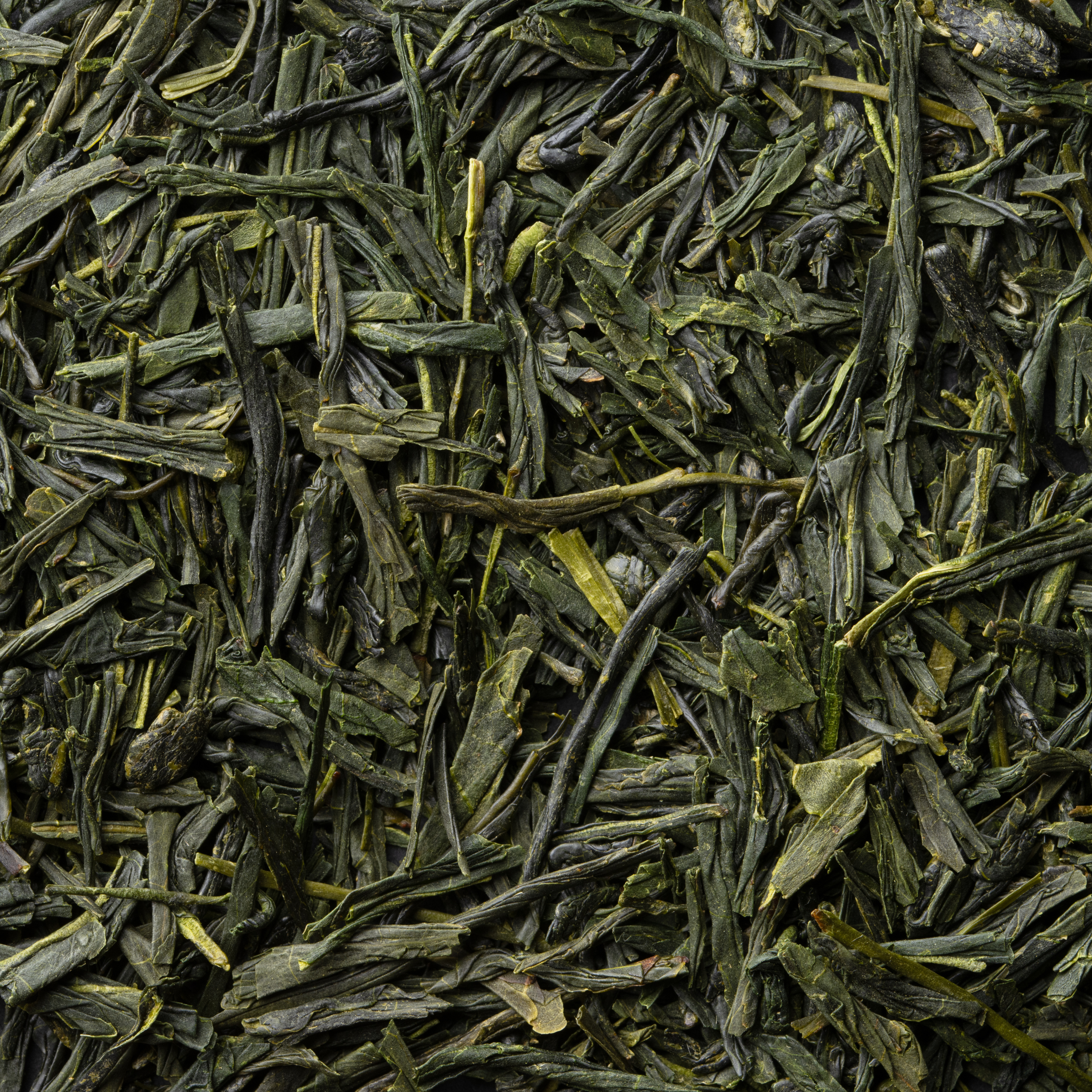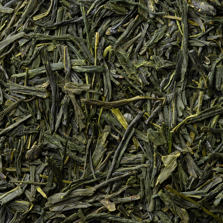Premium japanese loose leaf sencha green tea with a fresh grassy aroma, delicate umami notes.