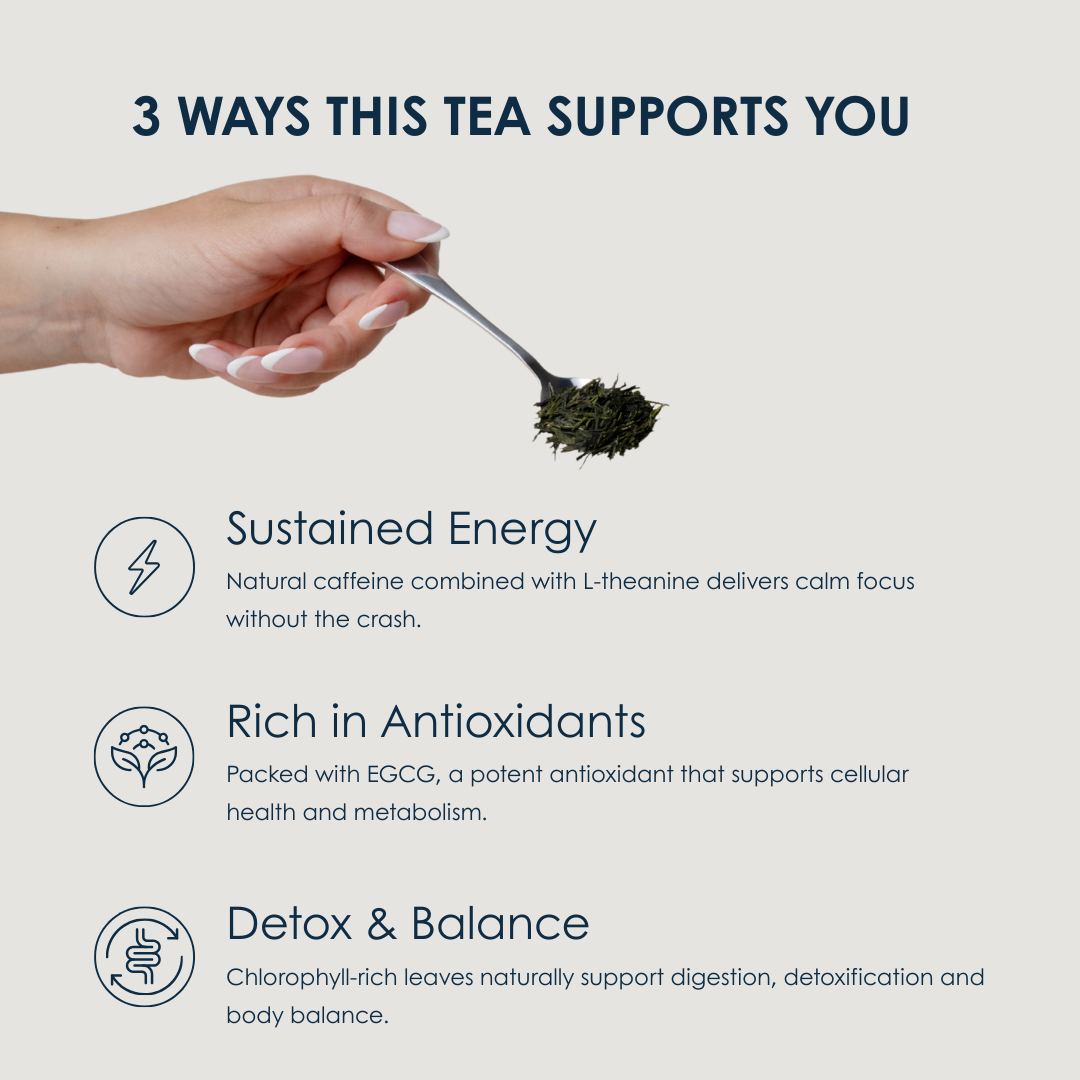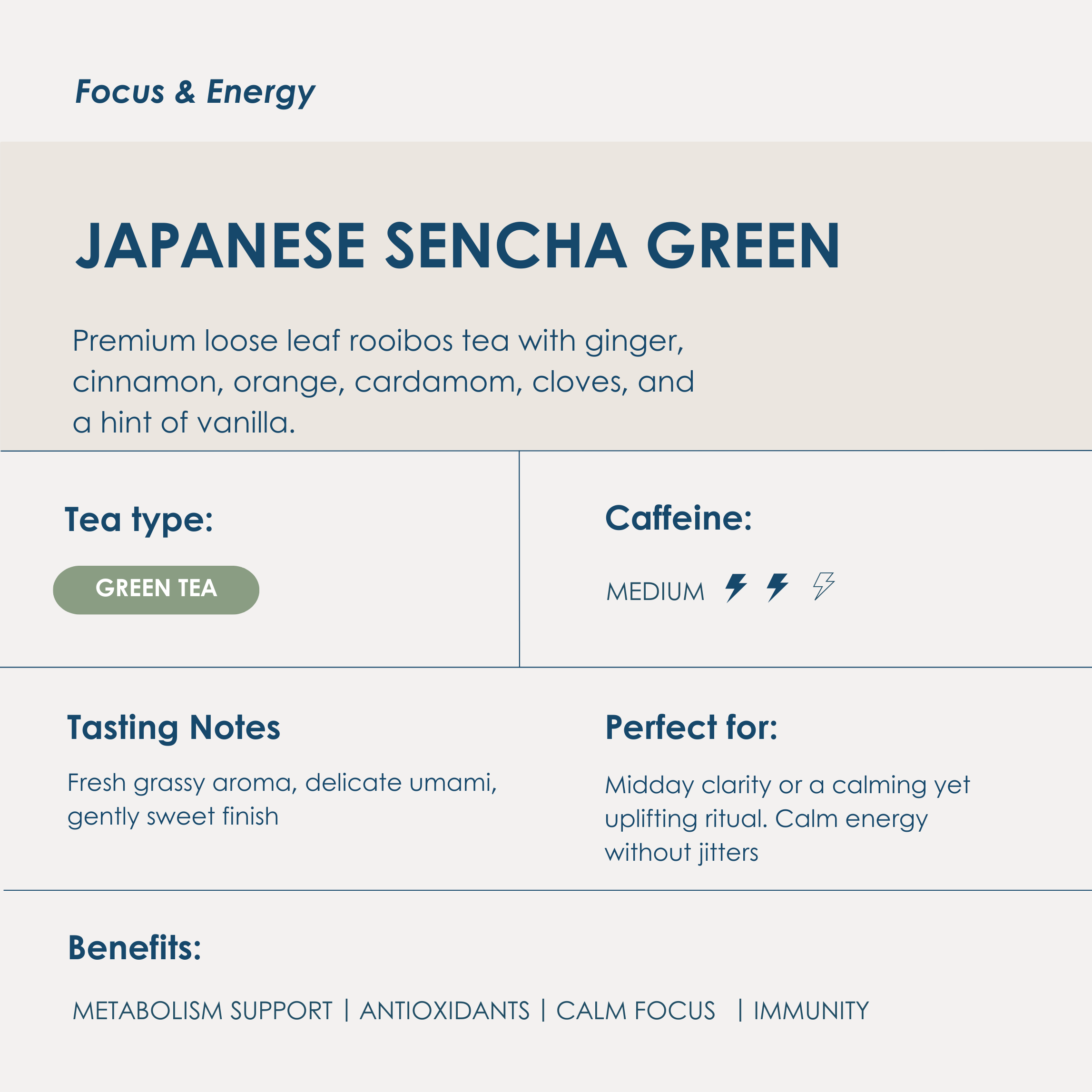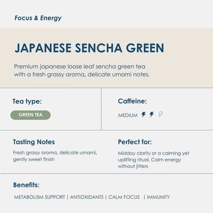 Japanese Sencha is rich in antioxidants and L-theanine, giving you calm focus, steady energy, and immune support. Light and refreshing with a hint of natural sweetness, it’s the perfect daily green tea.